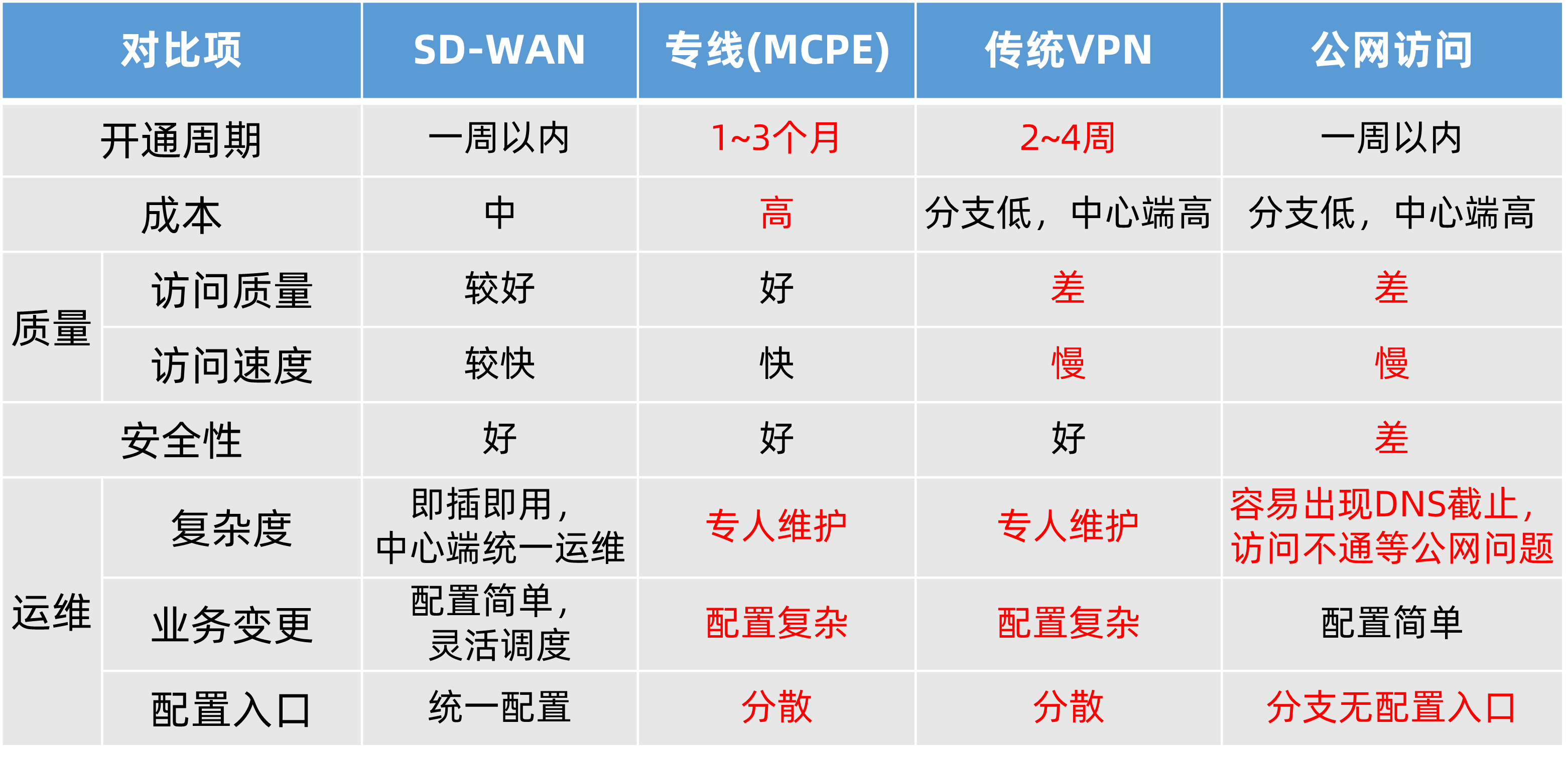 相较于传统VPN,MCPE,公网访问等方案,公司的SD-WAN方案具有采购成本低、开通时间短、集中化网络监管大幅降低运维成本等多重优势。