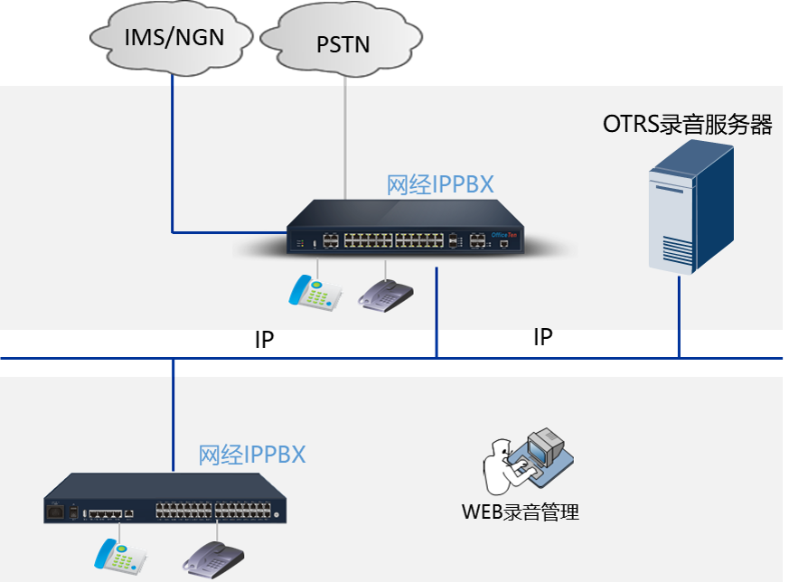 系统启用录音功能后可设置对指定的分机进行录音,录音分机进行局内呼叫或者与局外 PSTN /IMS建立通话时,系统将对通话录音,通话结束后,生成录音记录和文件存储到录音服务器。录音管理在本地 web 网管进行管理。分机开启录音后,通话建立即产生录音,内线通话或 SIP/E1/模拟中继通话都可以录音。