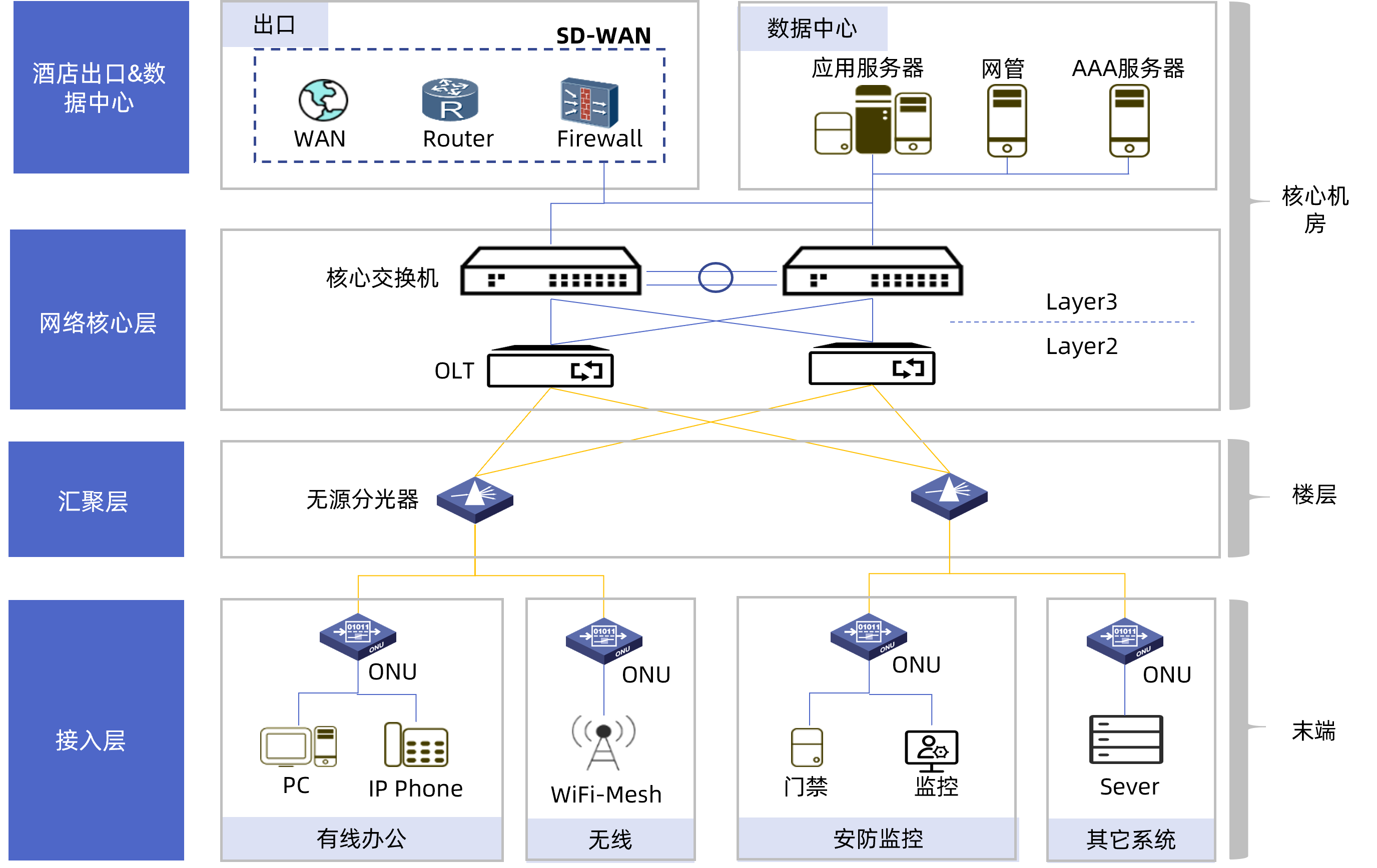 有线网络:由政企网关等ONU终端为各类设备提供有线网络接入(部分型号还同时提供POE供电)。