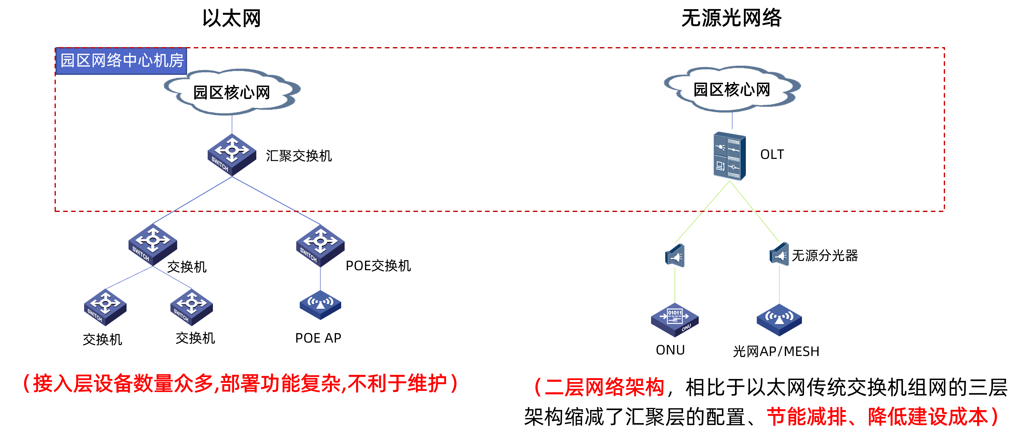 核心机房:增加放置OLT光网汇聚设备,通过万兆以太网上联核心交换机,通过PON光网下联园区各楼内所有网络终端;原有核心网设备的配置/策略维持原状,不需因为光网改造做任何改动。(部署OLT,通过分光器接入桌面终端,实现终端电脑需要根据部门划分来实现不同宽带使用)